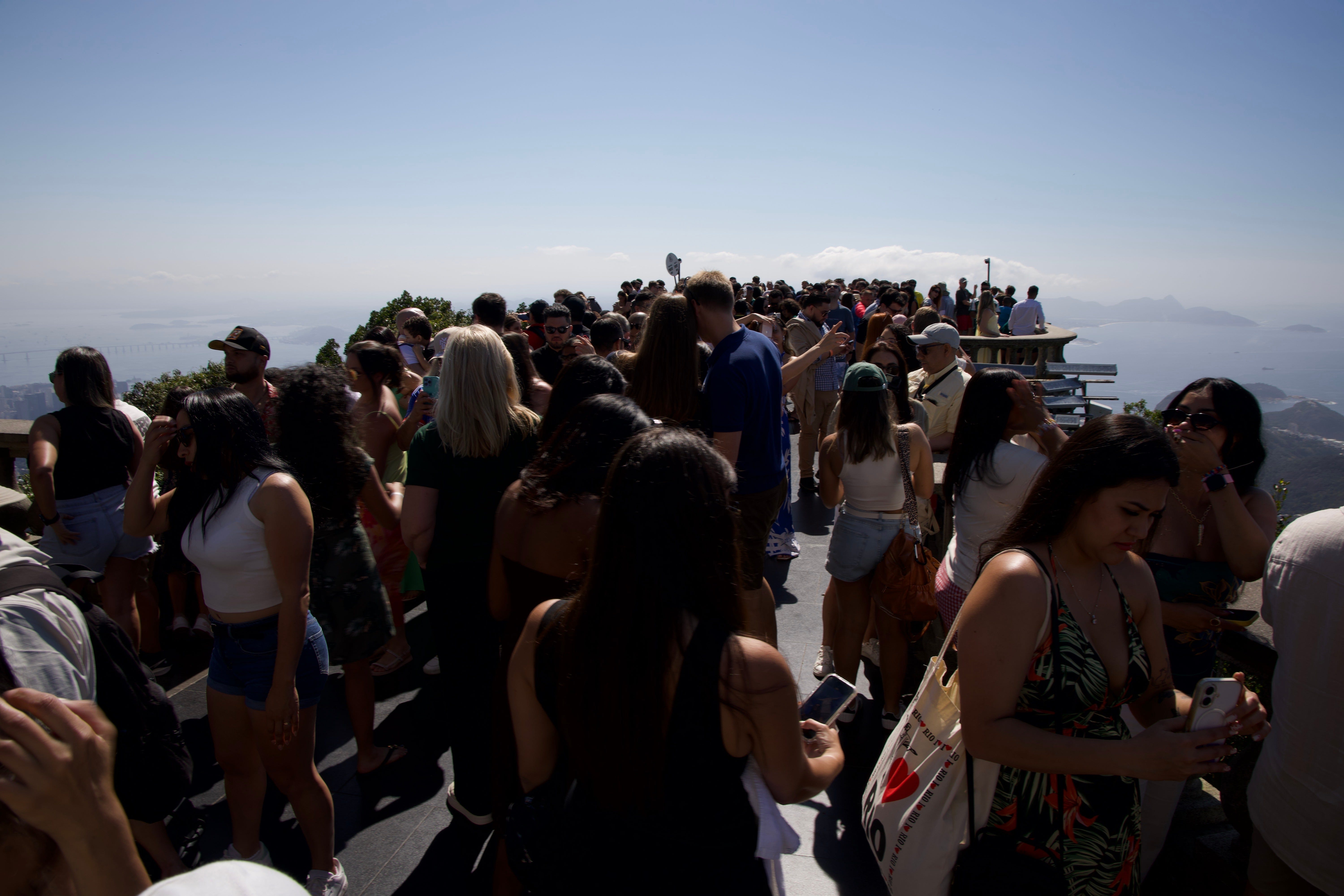 A hundred people performing the pose the statue already owns. Backs to Guanabara Bay. Guided by men making a living from it.