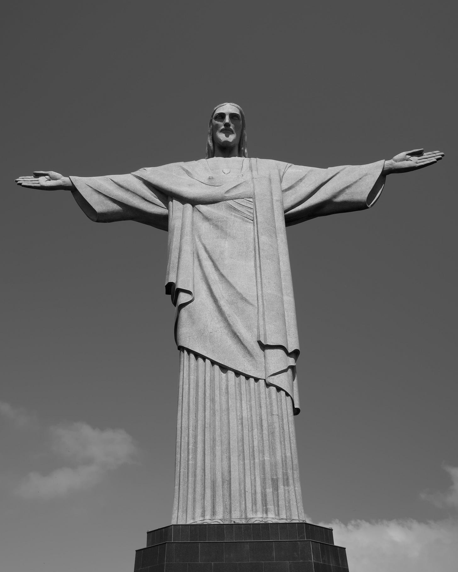 The statue behind them, arms open, looking at something nobody else was looking at.