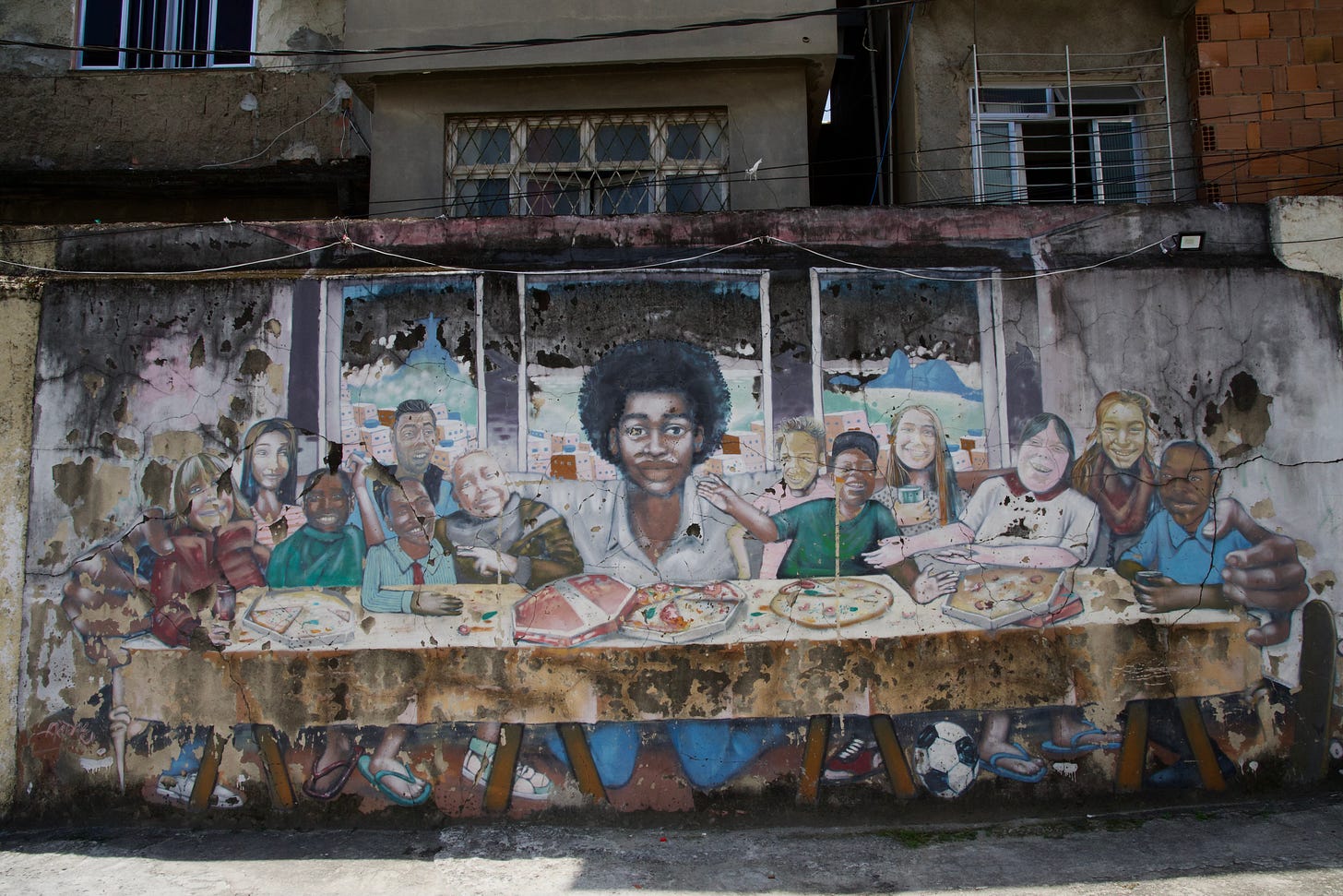 Blue-eyed Black Jesus at the center. Twelve disciples of different ethnicities. Football under the table. Skateboard. Takeaway pizza. Crumbling plaster around them.