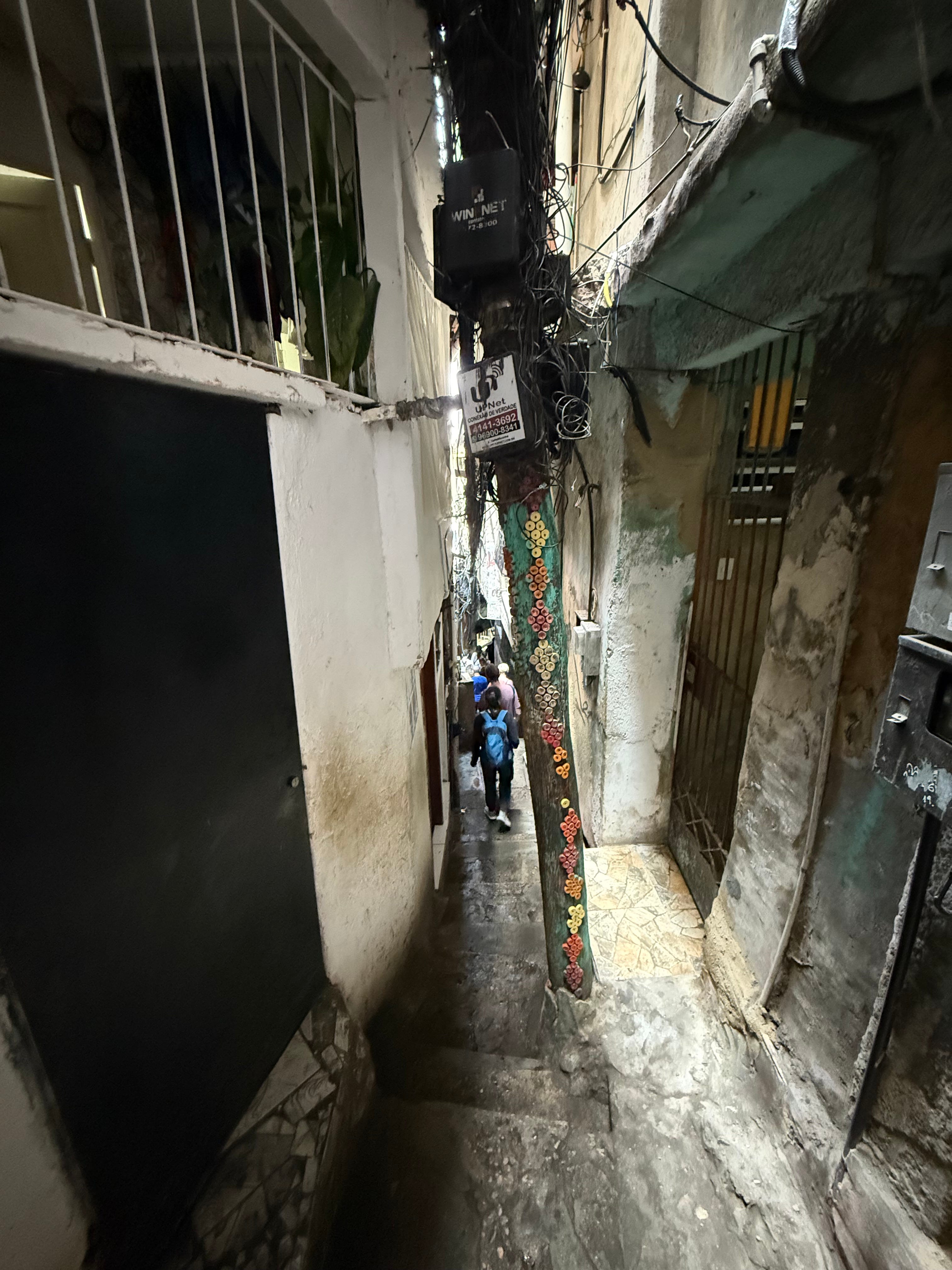 You can’t walk in on your own. You are scanned at the entrance, in the middle and at the end. Your guide advises cameras away. On one occasion: dealer with loud rap, gun on the table, two dozen plastic bags with a white substance that was not flour. On another: two men seated above road level, huge mirrors, watching that no threat from the city comes up. Tropa de Elite, real.